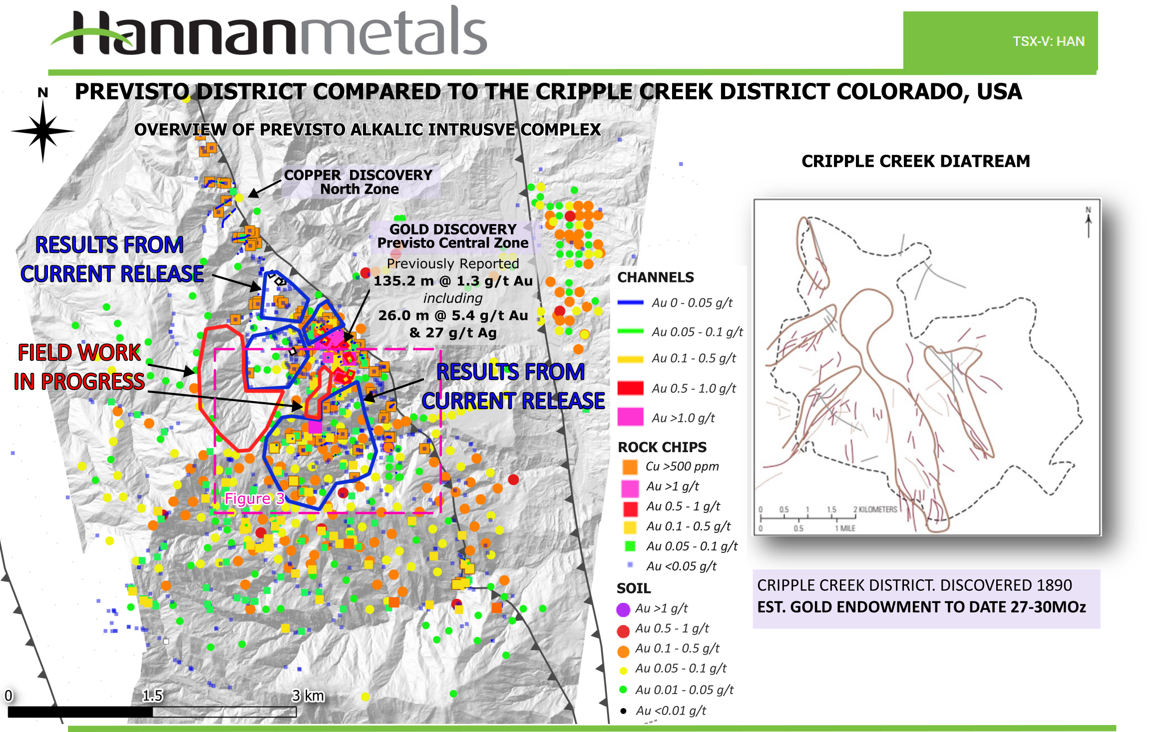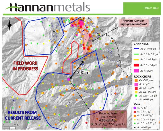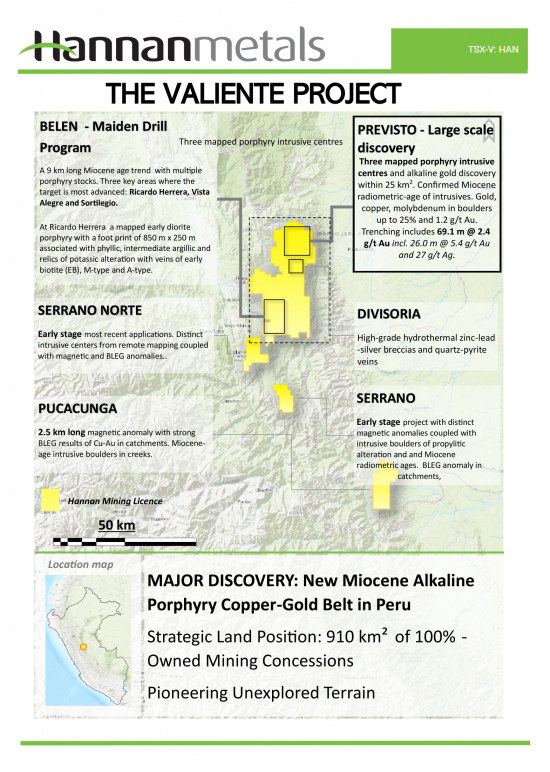 Vancouver, Canada -- Hannan Metals Limited ("Hannan" or the "Company") (TSXV: HAN) (OTCPK: HANNF) is pleased to announce new results from field campaigns conducted between the Honda Creek and Previsto Central prospects at its 100% owned Valiente project in Peru (Figure 1).