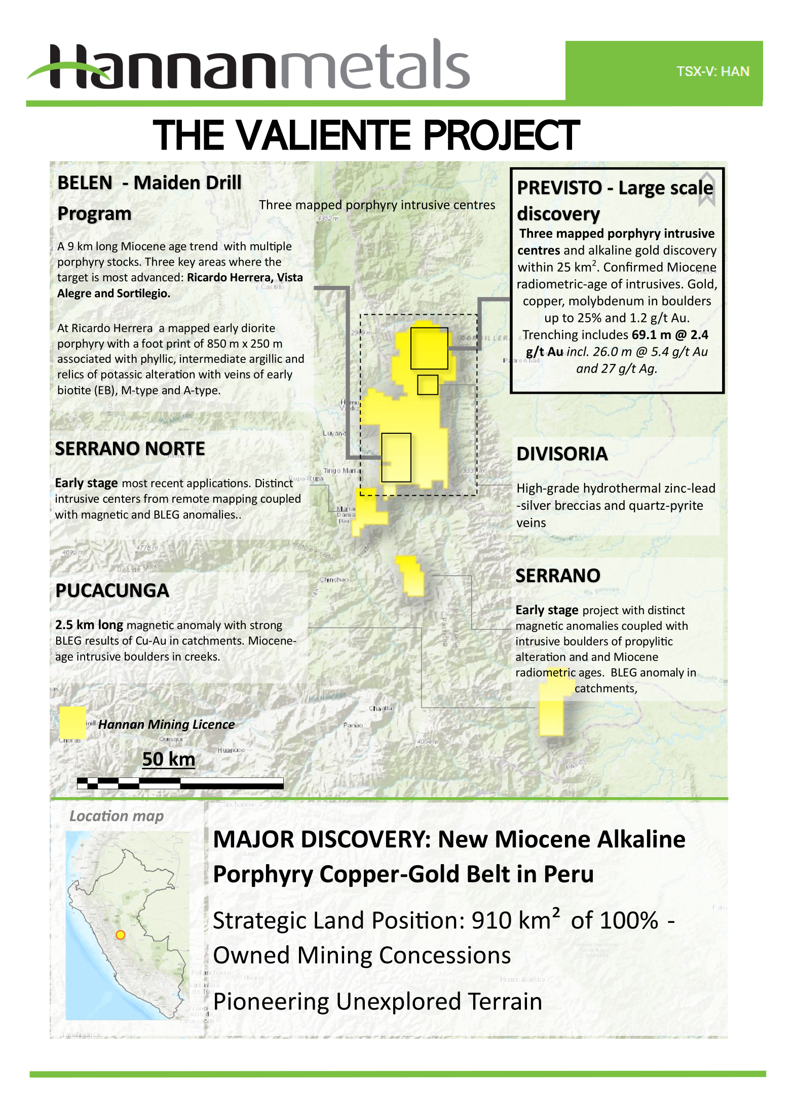 During 2021 Hannan staked and still holds 910 km2 of 100% owned mining concessions at Valiente covering unexplored terrain for potential mineralized porphyry targets in central eastern Peru. The Valiente Project has rapidly evolved from a greenfields prospect to a multi-prospect opportunity.
