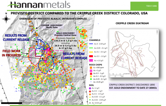 Figure 2: Map showing the vast 5x5 km gold anomaly at Previsto and the location of the current results, in comparison to the Cripple Creek gold district.
