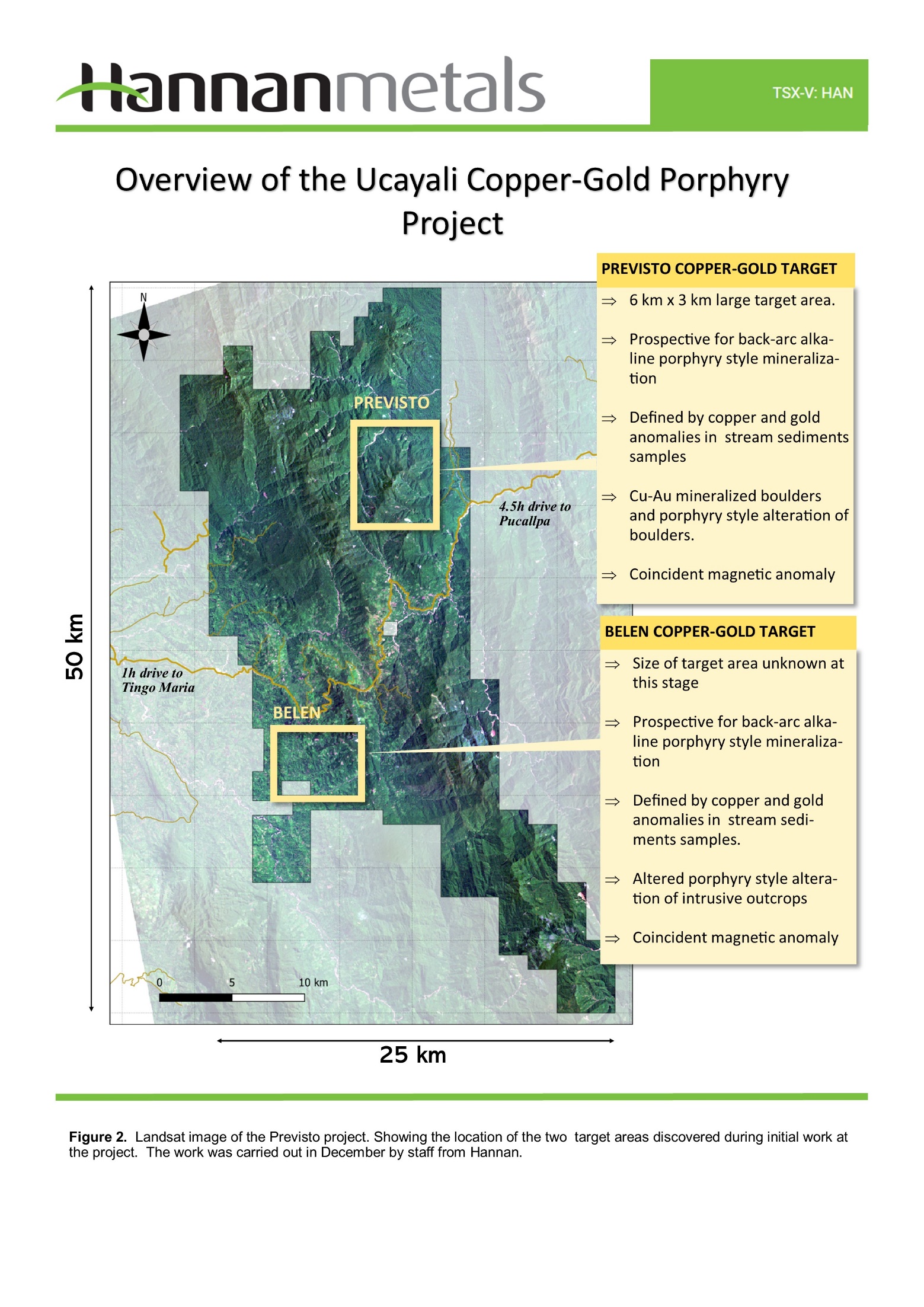 Vancouver, Canada – Hannan Metals Limited (“Hannan” or the “Company”) (TSXV: HAN) (OTCPK: HANNF) is pleased to announce initial field results from its 100% owned, 906 square kilometre, Ucayali project in Central Peru. Initial exploration has focused on two areas: Previsto and Belen, about 20 kilometres apart, with both stream sediment and float sampling and subsequent TerraSpec® spectral analysis being undertaken.