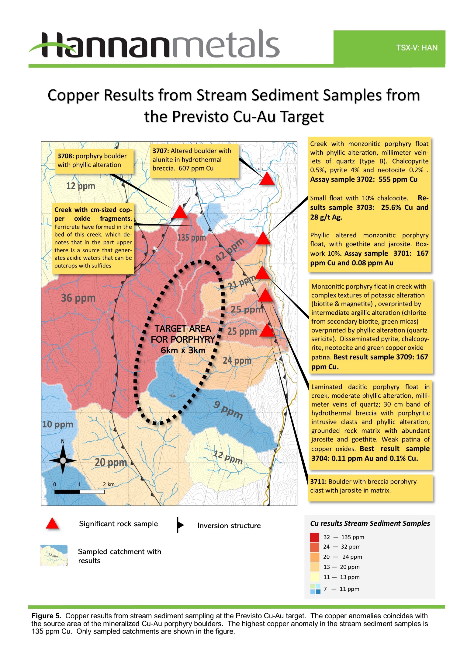 - Multiple copper and gold mineralized float samples were identified within a 6 kilometre x 3 kilometre area defined by copper and gold anomalous stream sediment sampling. The best float sample assayed 25.6% copper and 28 g/t silver, sample 3703 (Figure 2-5) from an interpreted supergene enrichment zone;