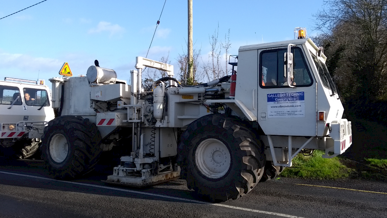 Photo 1: Two Vibroseis trucks, which stop every few metres for half a minute or so to produce the source vibrations.
