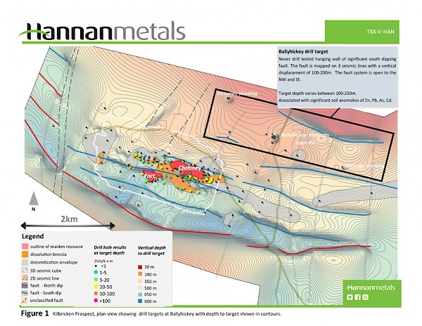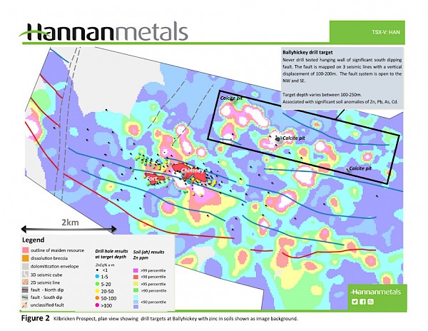 - Ballyhickey is a 2.5-kilometre-long untested, shallow target zone adjacent to a seismic-defined fault with a vertical displacement of 100-200 metres (Figure 1). This is the same offset observed on faults associated with mineralization at Kilbricken. The entire trend includes strong multi-element soil anomalies (Zn, Pb, As, Cd) (Figure 2) and includes the historic Ballyhickey mine;