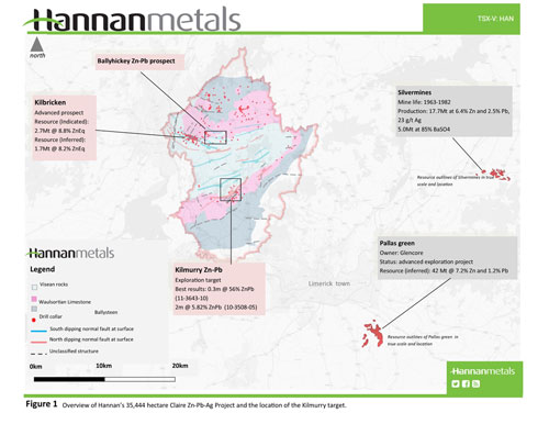 - Drilling has commenced at the Kilmurry zinc prospect, located 9 kilometres south of Hannan’s Kilbricken zinc-lead-silver resource in Co. Clare, Ireland;