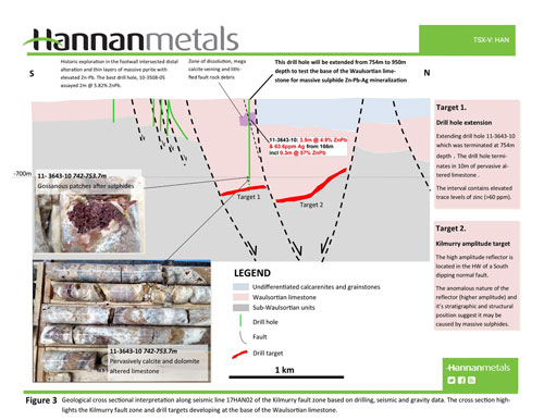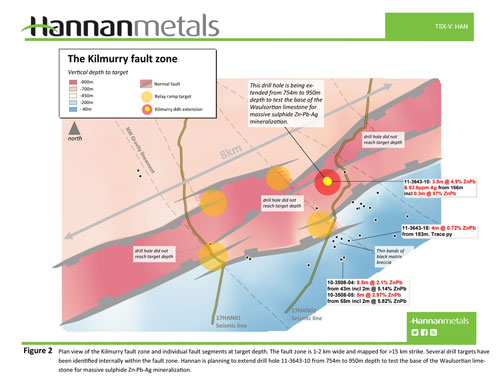 Furthermore, historic drilling has identified significant alteration and mineralization immediately south in the footwall of the Kilmurry fault zone. Four historic drill holes that have tested the hanging wall of the fault zone never reached the target depth. The holes were drilled over 3.5 kilometre strike and all encountered geological evidence to support the seismic interpretation of the fault zone. Drill hole 11-3643-10 is the most significant and it intersected structurally hosted massive sulphides at 166m depth (0.3m @ 56% zinc + lead). The drill extension of 11-3643-10 being undertaken by Hannan is the first test of the fault zone (Figure 2). If the extension of 11-3643-10 is successful, shallower ramp zones linking the fault segments will be targeted at Kilmurry.