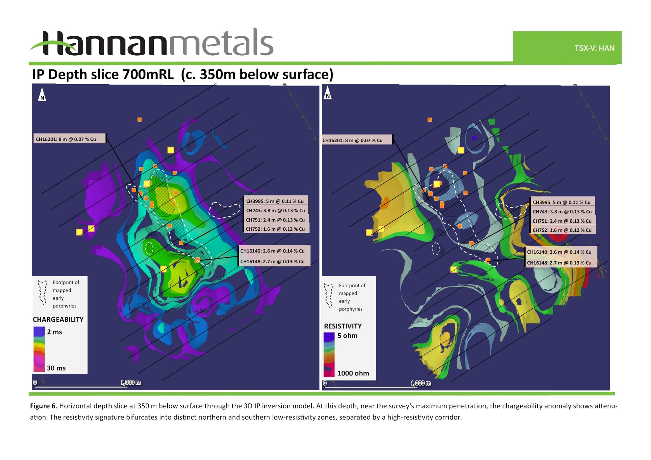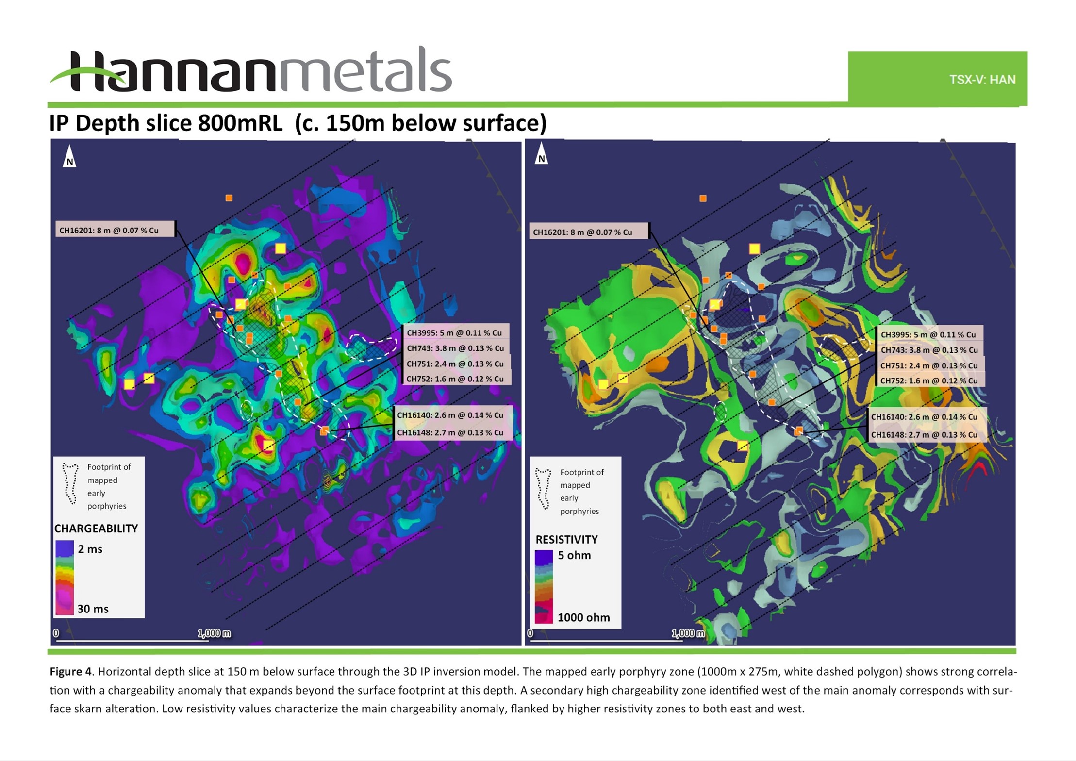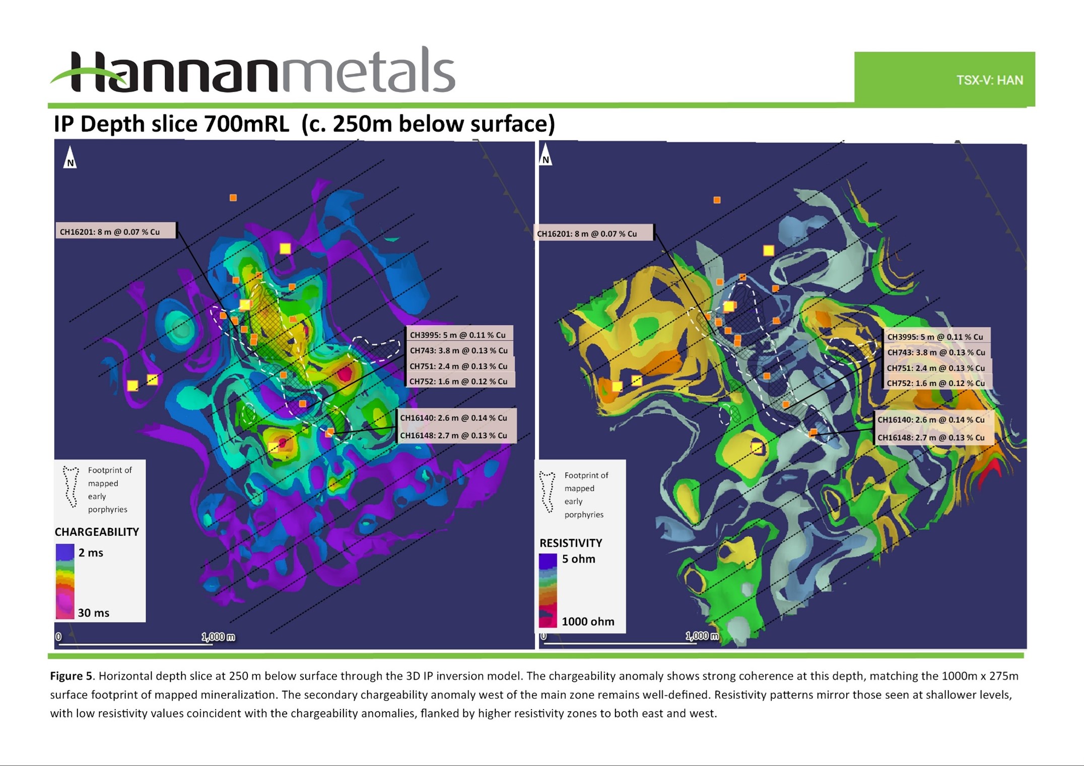 - A robust chargeability anomaly extending over 1,000 m strike length and 250 m width