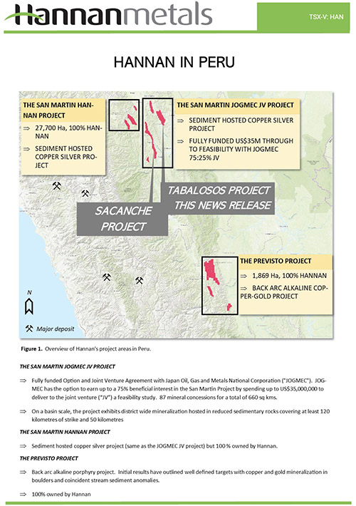 Vancouver, Canada – Hannan Metals Limited (“Hannan” or the “Company”) (TSXV: HAN) (OTCPK: HANNF) provides assay results from the first outcrop copper-silver discoveries from the Tabalosos project held within the San Martin JOGMEC JV sediment-hosted copper-silver project in Peru (Figures 1 and 2).