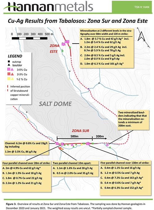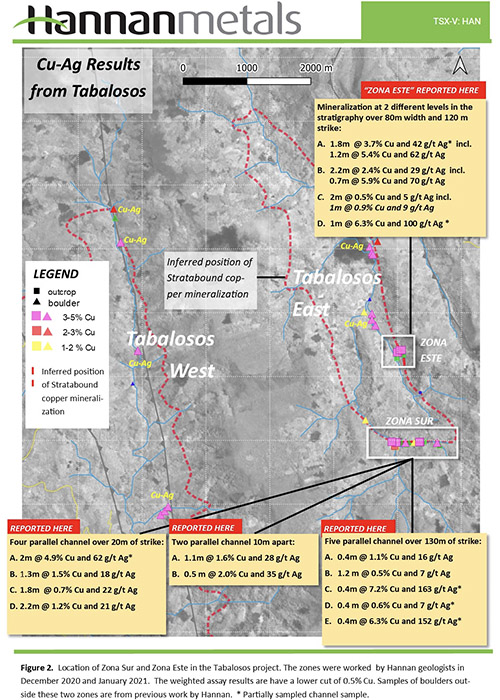 - First high grade copper-silver outcrop discoveries from the Tabalosos project held within the San Martin JOGMEC JV sediment-hosted copper-silver project in Peru. Outcrops have been delineated in two areas: Zona Este and Zona Sur that strike over a combined 2.5 kilometres. The discoveries were made by following up mineralized float samples in creeks found in 2019 by Hannan (Figure 2).;