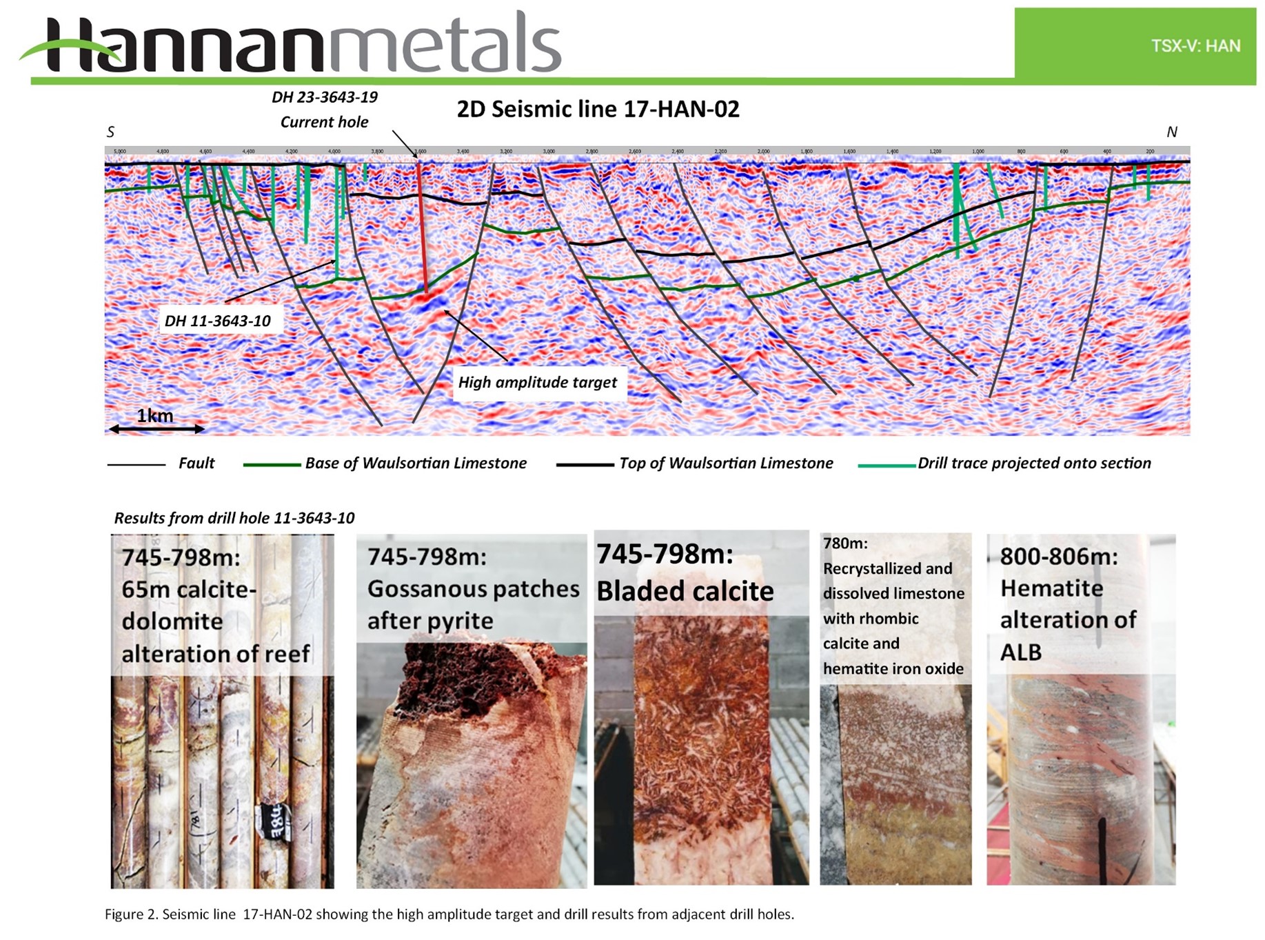 - The seismic reflector was identified in line 17-HAN-02, acquired by Hannan in 2018. The target extends over 1 km strike with the highest amplitudes focused in a 400 m wide zone at 700 m depth (Figure 2).