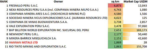 - With this increased tenure, Hannan becomes a top 10 concession holder in Peru (considering combined granted concessions and applications). The top 10 is dominated by some of the world’s largest exploration and mining companies and Hannan stands out as one of the very few juniors to acquire such a significant land position (Table 1);