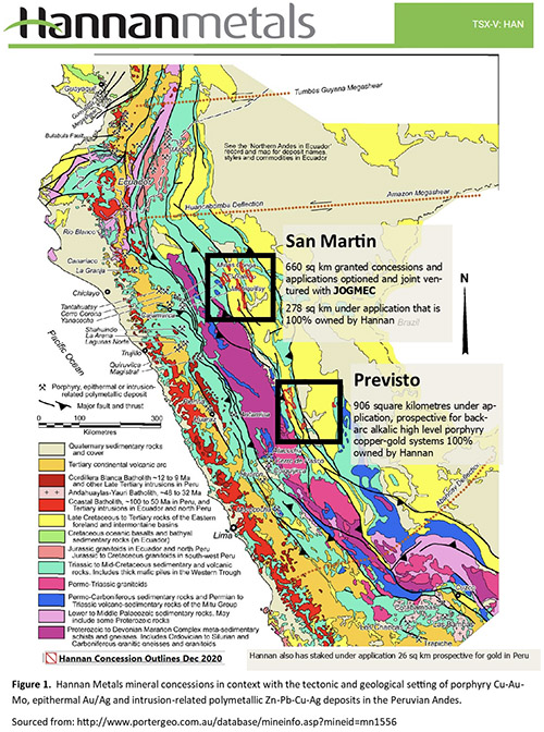- Hannan has increased its Peruvian mineral tenure holdings to 1,869 square kilometres (186,900 hectares) by staking an additional 932 square kilometres prospective for back-arc alkalic high level porphyry copper-gold systems (the “Previsto Project”) in central eastern Peru;