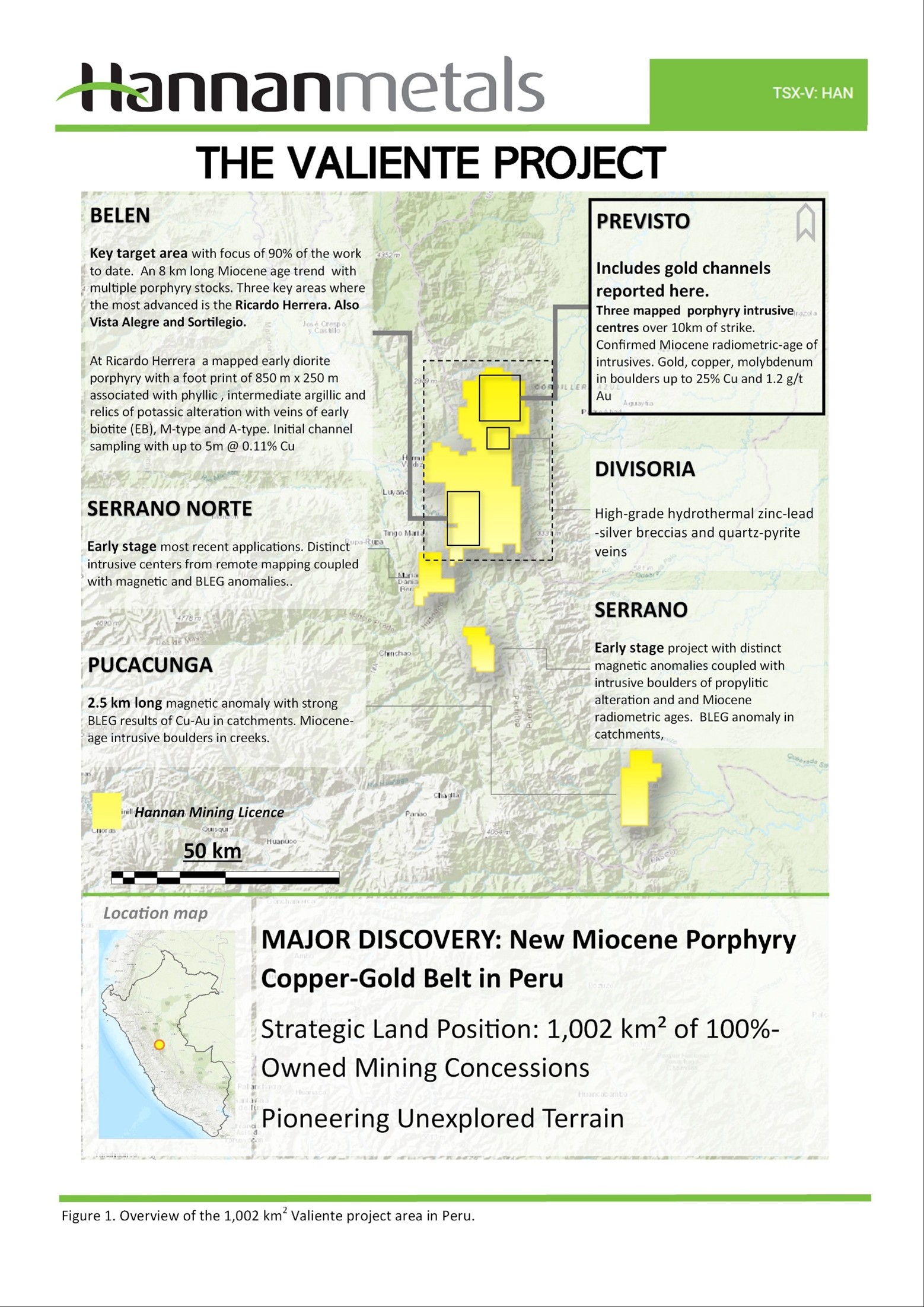 The 100% owned Valiente project is in central eastern Peru, east of the city of Tingo Maria (Figures 1 and 2). The area is characterized by steep topography on the eastern flank of the Central Cordillera with elevations between 800 m and 2,000 m above sea level (a.s.l.). The project was discovered in 2021 during an extensive greenfields prospecting program initiated by Hannan for back-arc porphyry copper-gold systems. The Company has been actively prospecting on the project since 2021 and has successfully gained social permits progressively in all areas of interest.