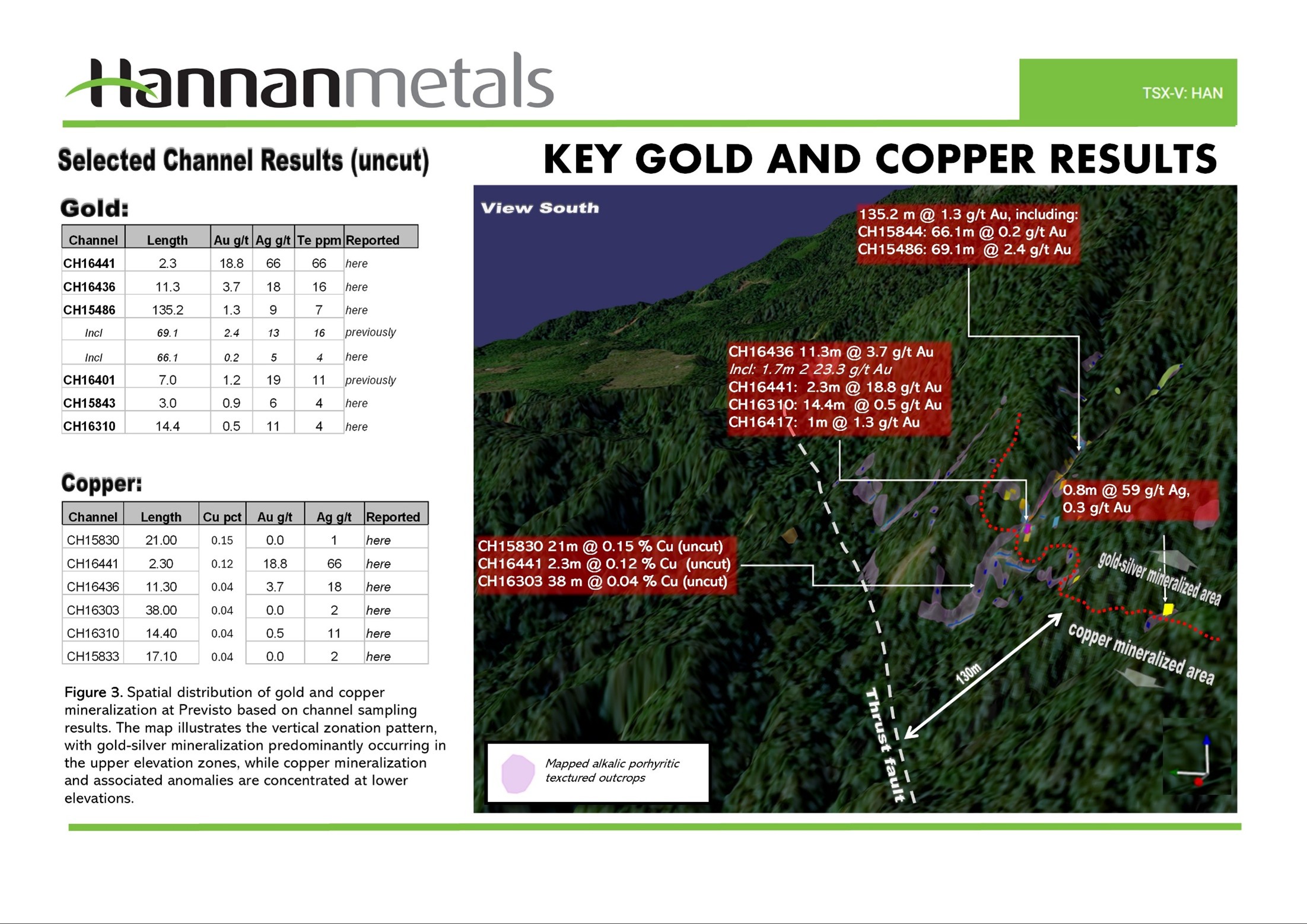New Outcropping Copper mineralization has been identified located 20 m from the gold mineralized channels. The spatial distribution of gold and copper mineralization at Previsto based on channel sampling results suggests a vertical zonation pattern (Figure 3). Gold-silver-tellurium mineralization predominantly occurs in the upper elevation zones, while copper mineralization and associated anomalies are concentrated at lower elevations. Better leached results in the copper zone include:
