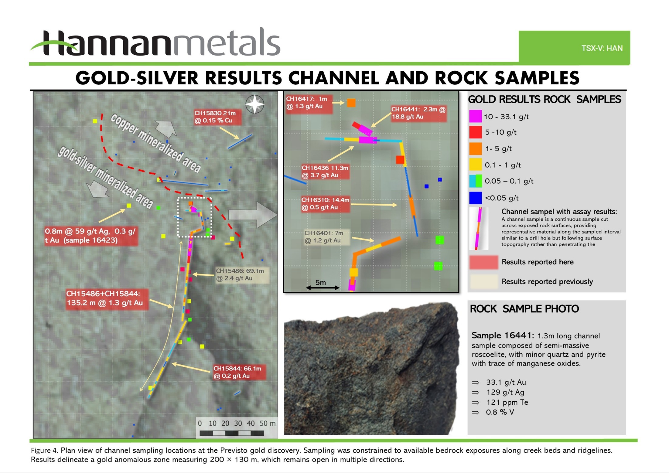 Vancouver, Canada — Hannan Metals Limited‘s (“Hannan” or the “Company”) (TSXV: HAN) (OTCPK: HANNF) is pleased to report expanded high-grade gold mineralization at its 100%-owned Previsto alkaline gold project in Peru (Figure 1).