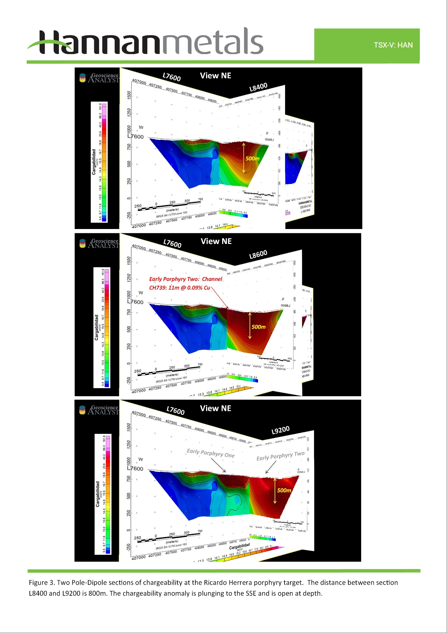 - The IP Pole-Dipole geophysical survey mapped a combined chargeable and resistivity zone over an area of 800 m by 600 m on surface, and to at least 500 m depth, to the maximum depth limits of the survey and therefore remains open to depth. The body is plunging to the south-southeast and the southern proportion is under quaternary cover. Chargeabilities range from 20 mV/V to 60 mV/V. The high chargeability body is associated with high resistivity which is a common petrophysical correlation in porphyry deposits. See Figure 3-8 for details.