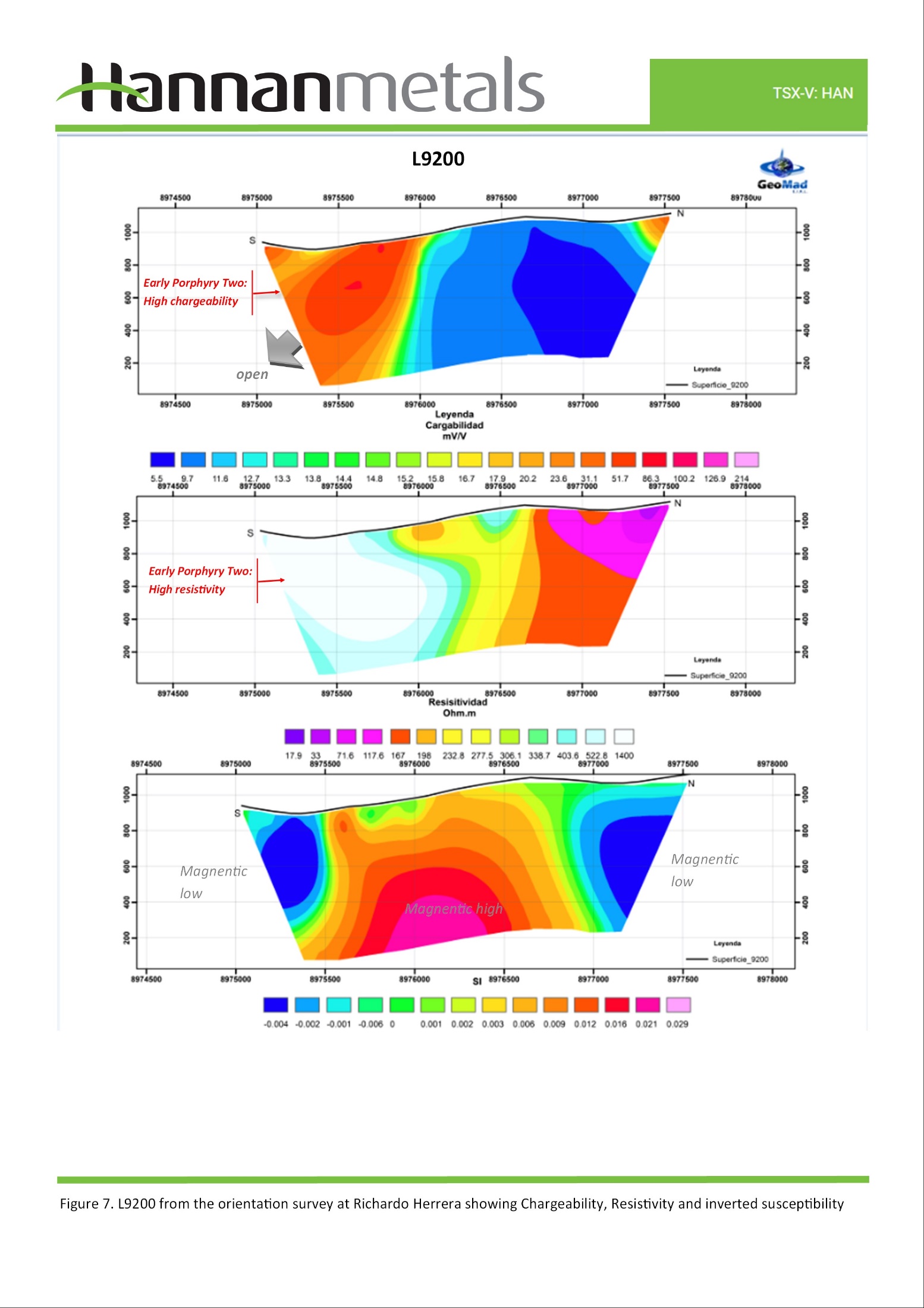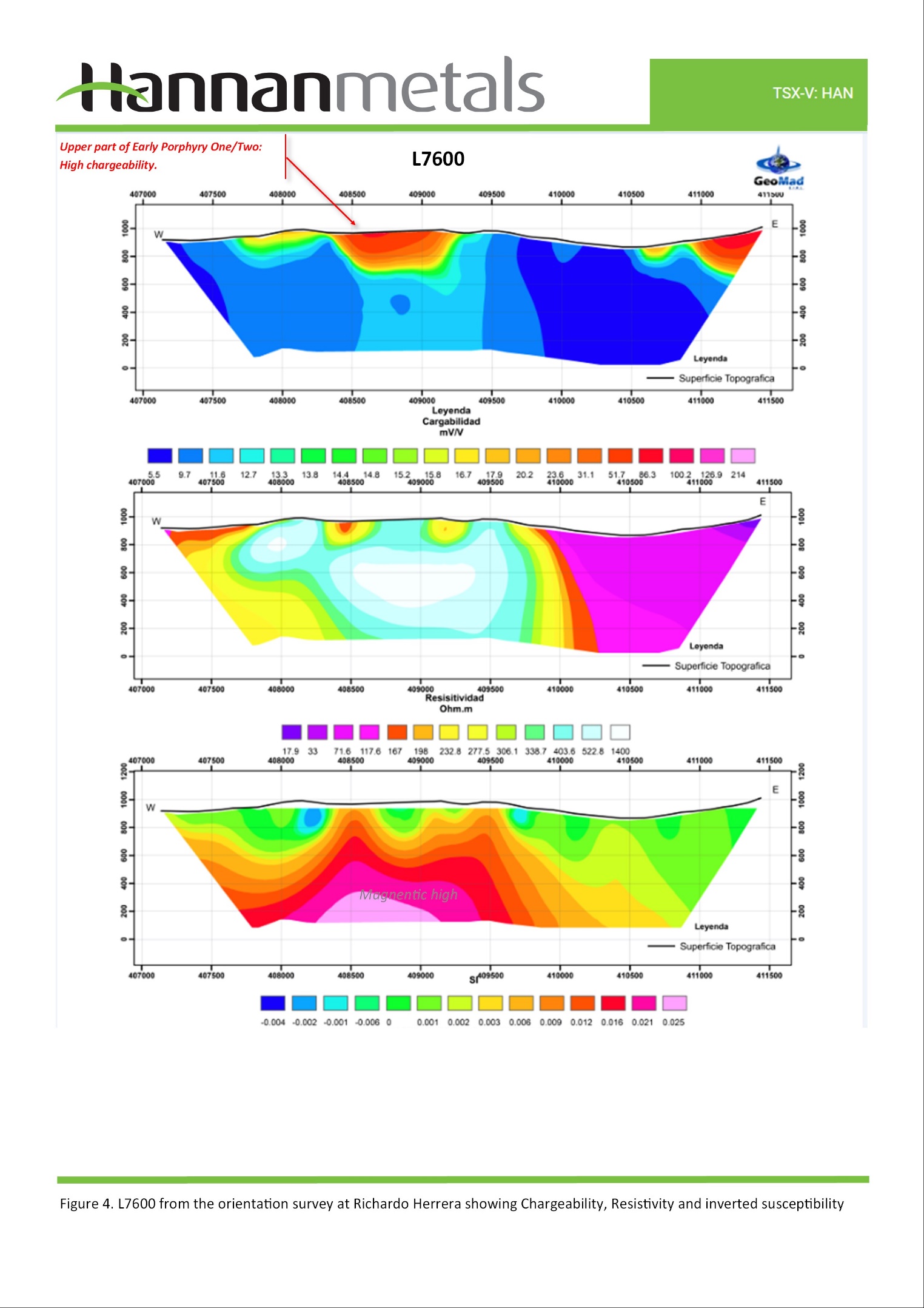 For the IP Geophysical survey Hannan contracted GEOMAD Servicios Generales EIRL, Lima, Peru to undertake and a Induced Polarization survey. The following survey parameters were applied: Pole-Dipole configuration with an electrode spacing of 50m, and measurements at every 50m.