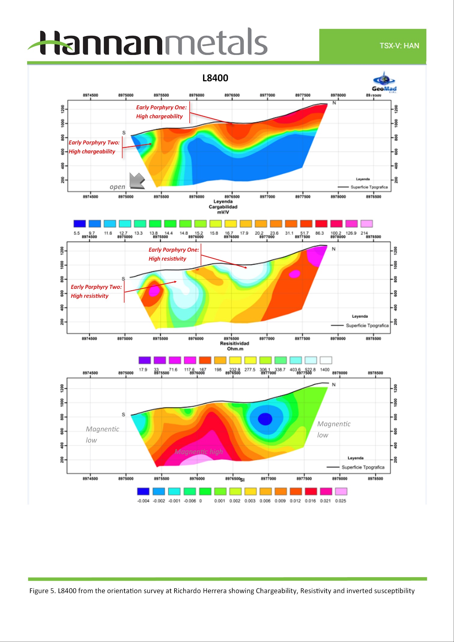 The results of this survey at the Ricardo Herrera prospect identified two chargeable zones corresponding to two mapped porphyry units. Each represents a significant exploration target. The second target demonstrates the greatest potential with a chargeable zone over 800 m x 600 m and to at least 500 m depth which remains open.