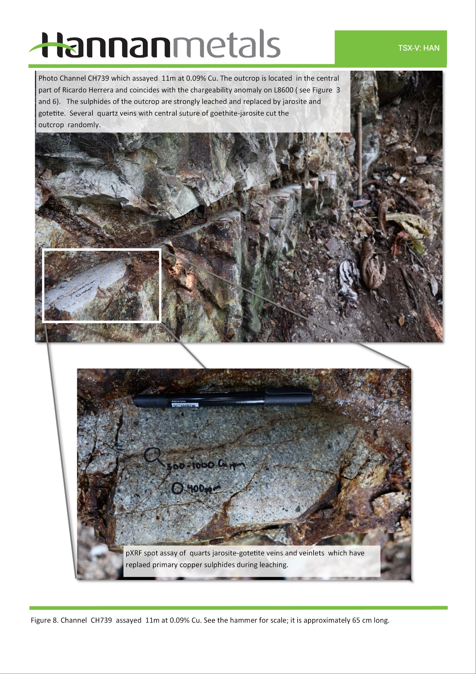 - In total, 16 channels for 67 m of sampling from sporadic leached outcrops have been sampled from this unit. Samples averaged 4.0 m at 708 ppm copper and 2 ppm molybdenum, and ranged from 1.6 m to 8.0 m thickness, 334 ppm to 1,308 ppm copper, and 0.7 ppm to 9 ppm molybdenum (Figure 2).