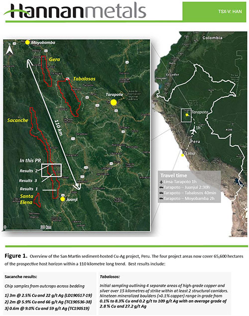 Vancouver, Canada – Hannan Metals Limited (“Hannan” or the “Company”) (TSXV: HAN) (OTCPK: HANNF) provides an update on its exploration and social programs at the 100% owned copper-silver San Martin Project in Peru. San Martin is a newly discovered, basin-scale high-grade copper-silver project that extends for 120 kilometres along the foreland region of the eastern Andes Mountains in Peru (Figure 1).