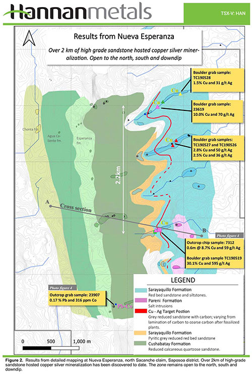 - Nueva Esperanza lies within a regional trend of previously reported outcrop samples from the Sacanche claim. Outcrop sampling 5 kilometres north of Nueva Esperanza returned high grade results including 2 metres @ 5.9% Cu and 66 g/t Ag and sampling 16 kilometres south of Nueva Esperanza returned 3 metres @ 2.5% Cu and 22 g/t Ag (Figure 1).