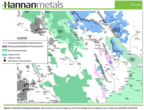 The project consists of a total of 87 mining concessions (mineros petitorios), 40 concessions which have been granted. None of the granted areas are located next to or inside protected nature reserve zones. Only three application areas (out of 87 concessions in total) are partially overlapped by protection areas, which will likely be excised or observed on granting. Within all Hannan’s areas only a small percentage (4.7%) fall within indigenous areas, which are all located in the south of the Tabalosos area (Figure 6). Most of the prospective rock sequences in the Huallaga Basin have now been staked by Hannan and third-party companies (Figure 6).