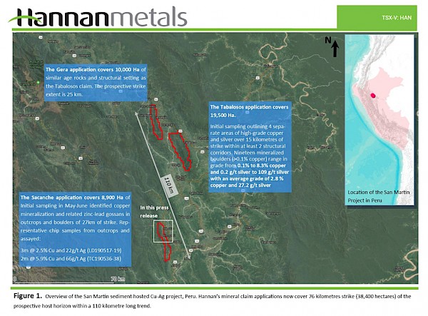 Michael Hudson, Hannan’s CEO, states, “The sediment-hosted copper-silver San Martin project presents a new basin-scale copper-silver district in Peru. Granting of the first mining concession is a key advancement and provides secure tenure which will allow for more advanced social and work programs to be executed, including drill permitting. We look forward to further developing trusted relationships with local communities during our upcoming exploration programs over this large project. The next technical steps include further geological and prospecting with an aim to achieving drill permitting in early 2020.”
