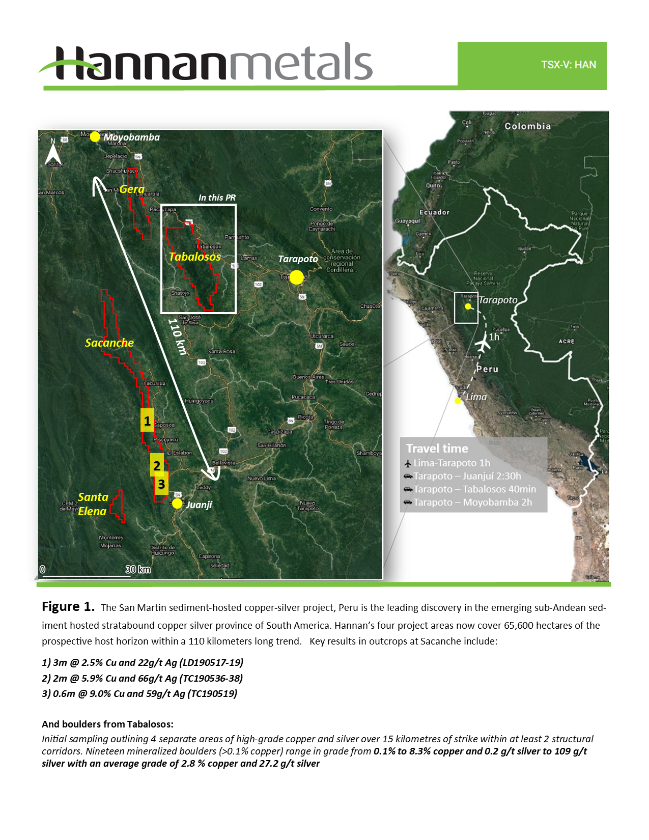 Vancouver, Canada – Hannan Metals Limited (“Hannan” or the “Company”) (TSXV: HAN) (OTCPK: HANNF) provides an update on the Tabalosos copper-silver project, located 80 kilometres north of the Sacanche project at the 100% owned San Martin sediment hosted copper-silver project in Peru (Figure 1).