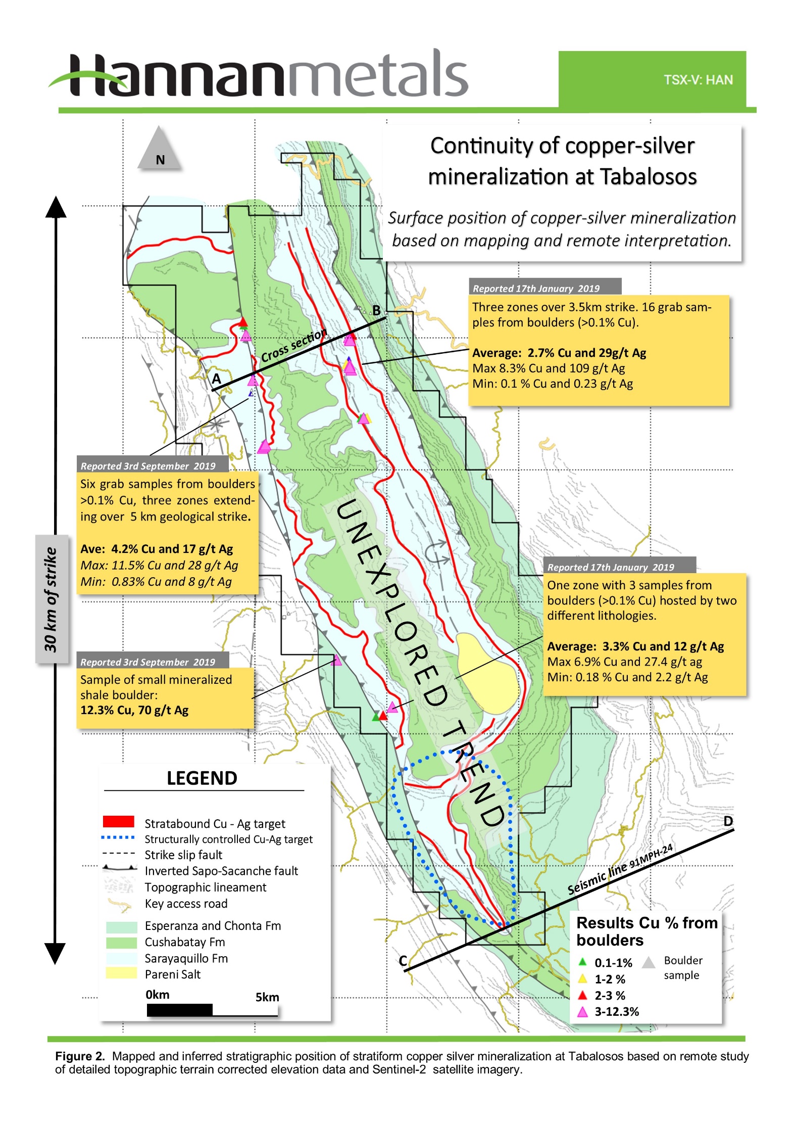 - Hannan has completed a remote geological study at the Tabalosos project which has defined and constrained the target position of stratabound copper-silver mineralization over a 30 kilometre trend;