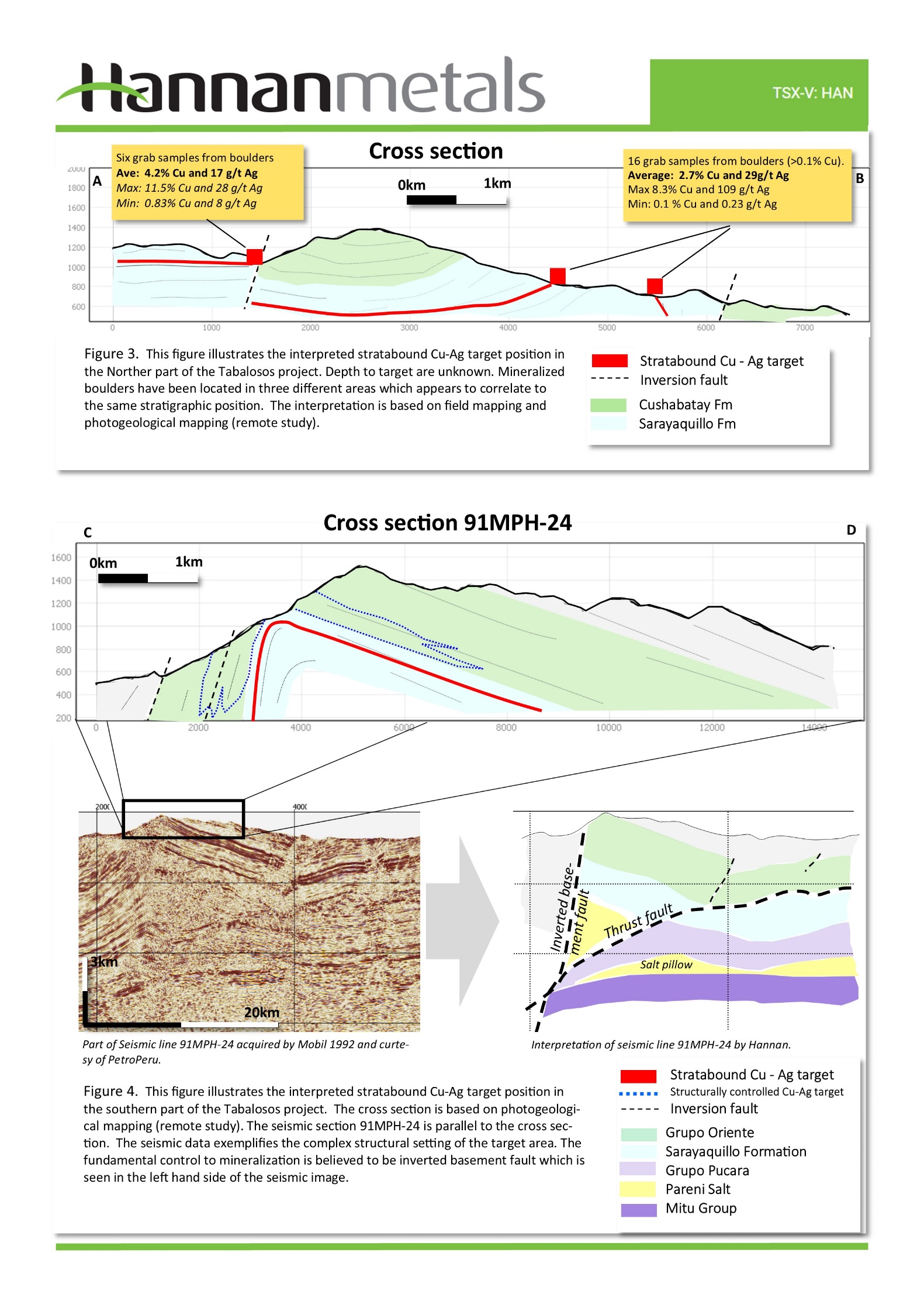 Interpretations from seismic surveying from earlier petroleum exploration shows that the western flank of the Tabalosos project is cut by an inverted basement fault (Figure 2). High grade copper boulders have been located along a 15km long trend. In the southern part of the project area, the inverted basement fault truncates an anticline of the Cushabatay and Sarayaquillo Formations. This area is also prospective for structurally controlled sandstone hosted copper-silver mineralization where hydrocarbons acts as the main trap for copper bearing fluids. Copper anomalous boulders of this style have been discovered by Hannan in the area.