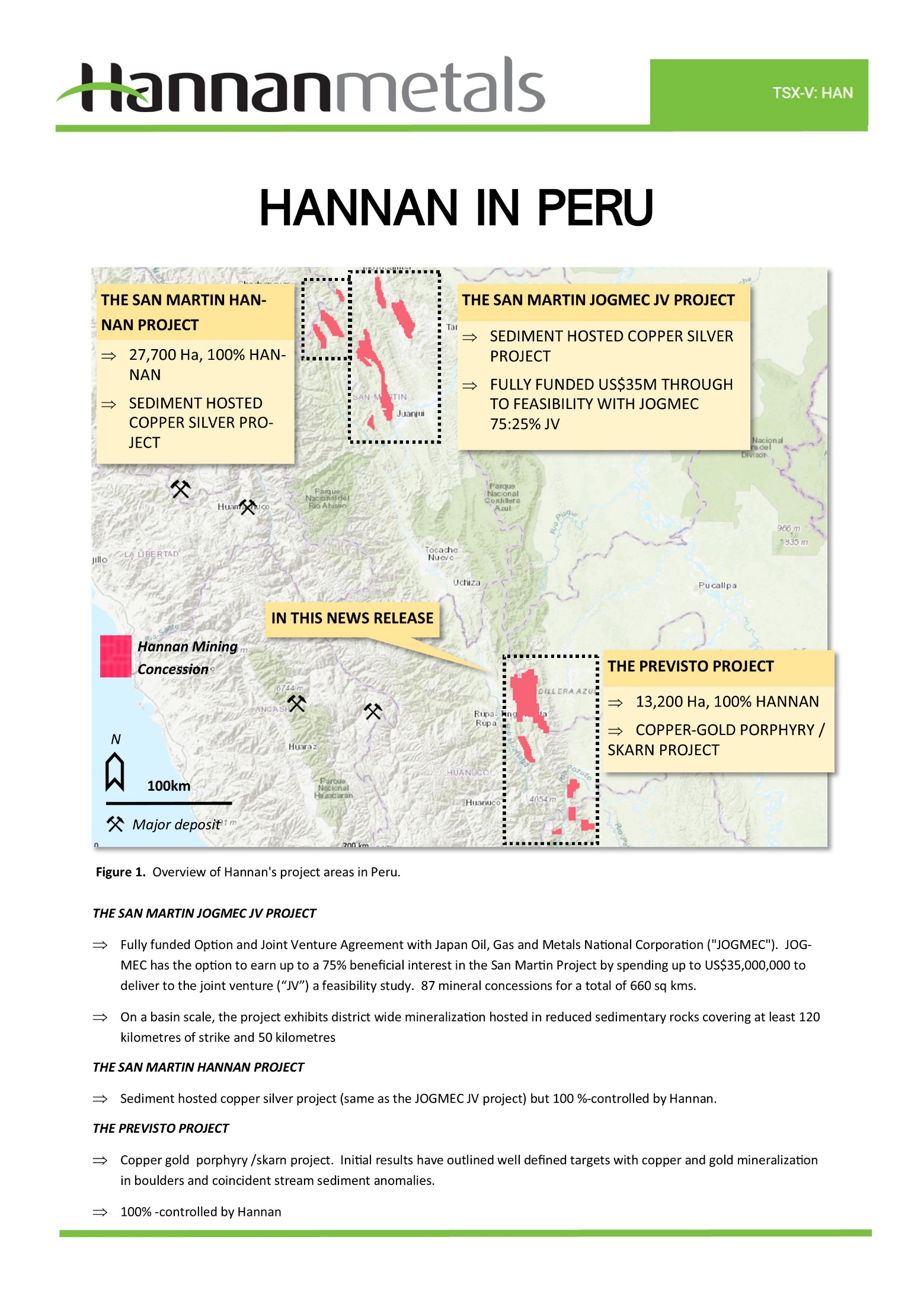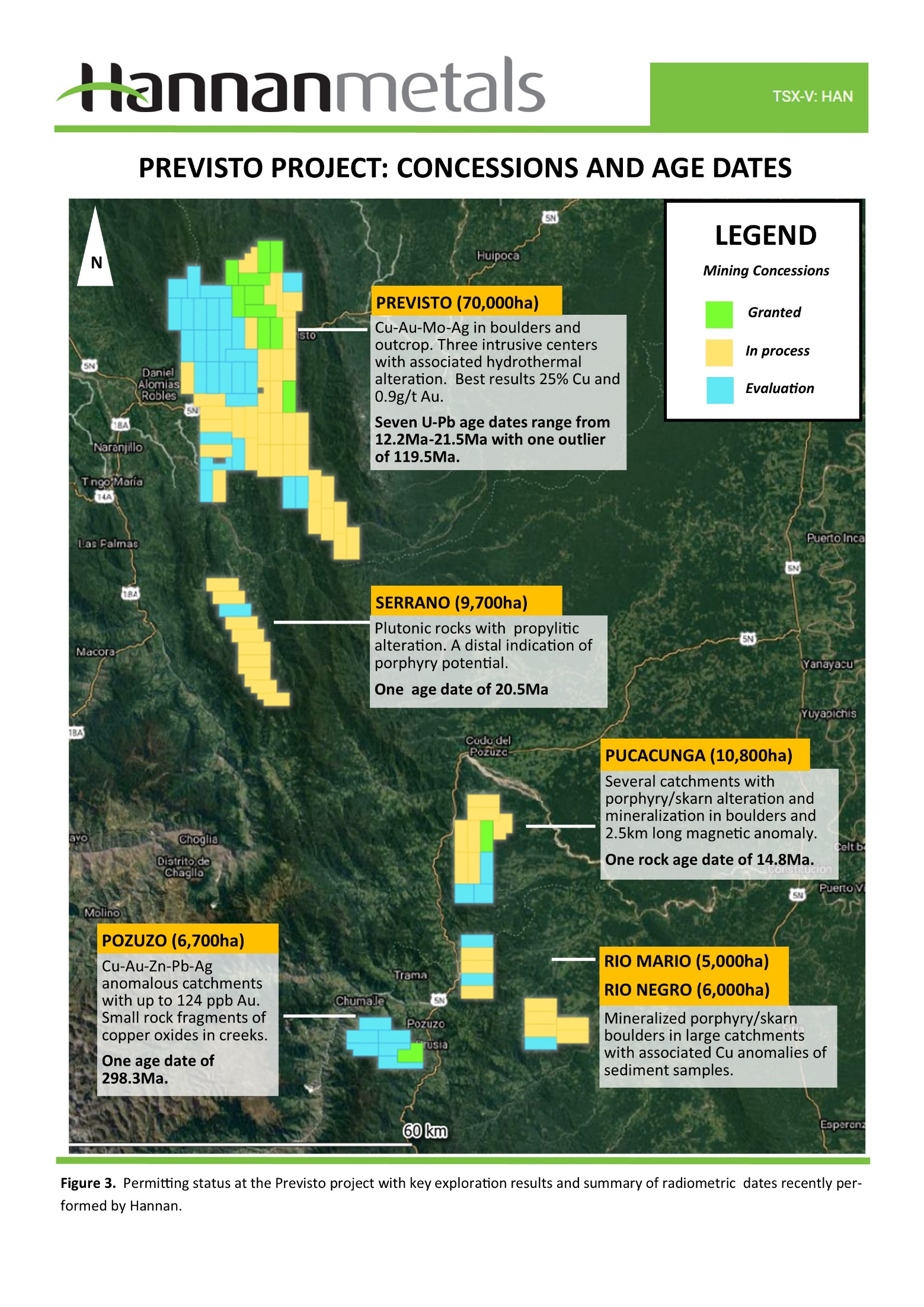 Vancouver, Canada – Hannan Metals Limited (“Hannan” or the “Company”) (TSXV: HAN) (OTCPK: HANNF)is pleased to report that U-Pb zircon dating on four porphyry intrusive centres within an area of 140 by 50 kilometres has defined a previously unrecognized Miocene metallogenic belt associated with significant BLEG, float and outcrop Cu-Au geochemical anomalism at its 100%-owned Previsto project in Peru.