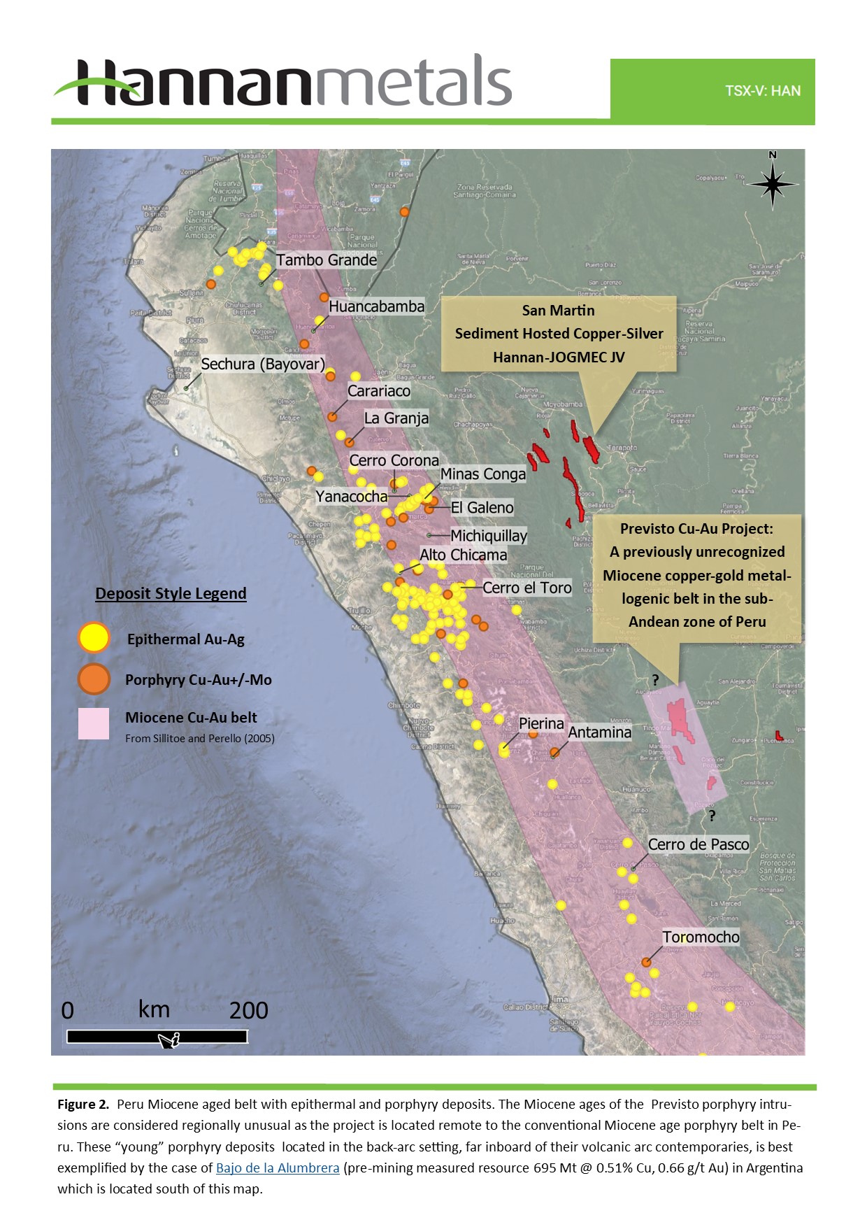 - This new district overlaps in age with the Miocene magmatic arc in the Western Cordillera of Peru, where some of Peru’s largest porphyry copper+/-gold and epithermal gold deposits were formed at the same time. This work ‘re-draws’ the map of where such deposits can be found and verifies Hannan’s assumptions that Previsto represents a new search space in a country thought to be mature in its exploration potential. (Figure 2).