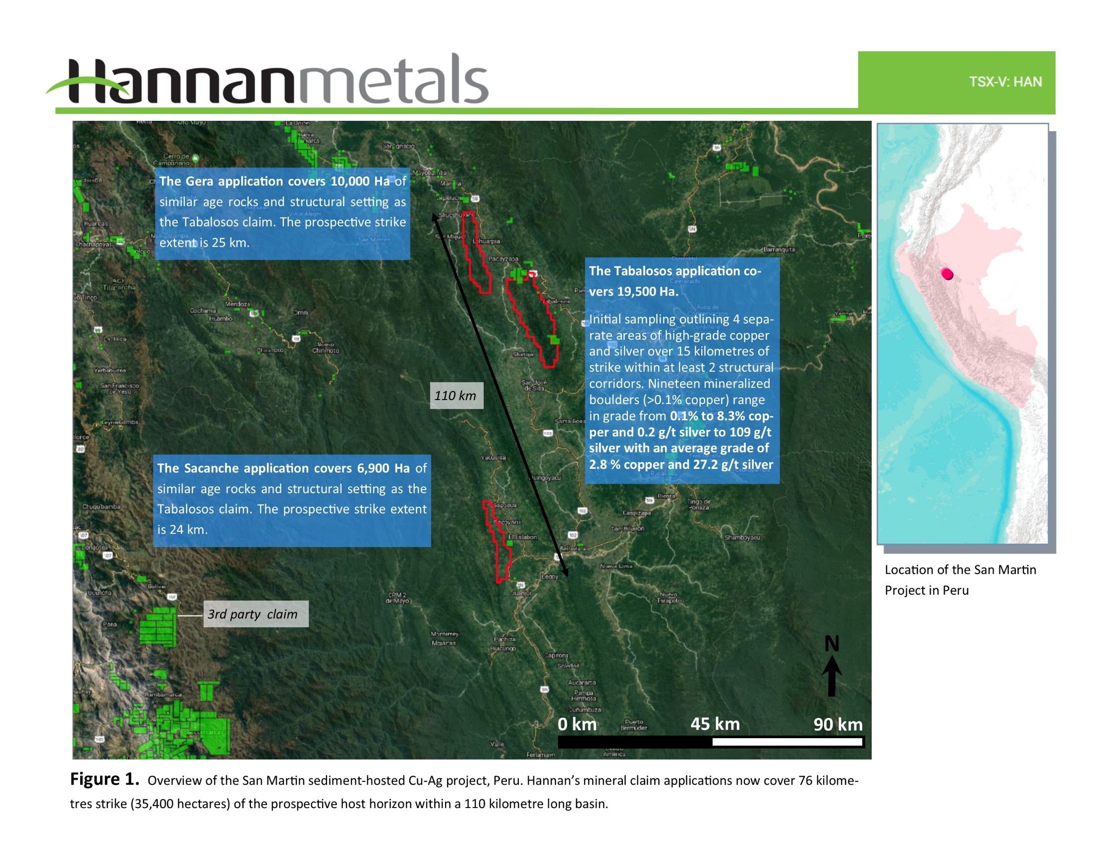 Vancouver, Canada – Hannan Metals Limited (“Hannan” or the “Company”) (TSXV: HAN) (OTCPK: HANNF) announces first field results from the Sacanche area of the San Martin sediment-hosted copper-silver project in north-central Peru. Sacanche (Figure 1) is located 80 kilometres south of Tabalosos, where Hannan has previously sampled high grade copper-silver mineralization.