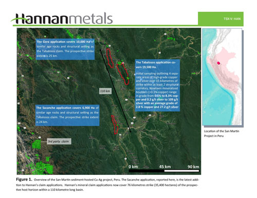 Vancouver, Canada – Hannan Metals Limited (“Hannan” or the “Company”) (TSXV: HAN) (OTCPK: HANNF) is pleased to announce it has further expanded the area under mineral claim application at the San Martin sediment-hosted copper-silver project in north-central Peru. A district-scale sediment-hosted copper terrane is now secured, with applications covering more than 76 kilometres strike of the prospective host horizon.