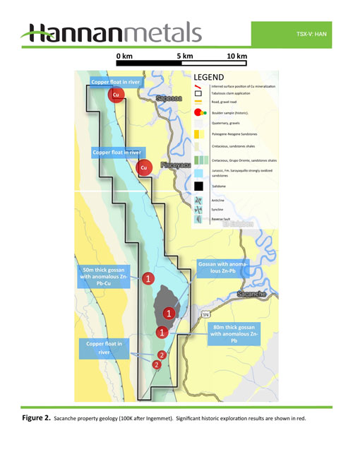 The Sacanche claims are an extension of the sediment hosted copper-silver mineralized position discovered in Gera and Tabalosos claim applications where initial sampling by Hannan outlined four areas of high-grade copper and silver over 15 kilometres of strike within at least two structural corridors within the Tabalosos claim application area. Nineteen grab samples from mineralized float in river beds (>0.1% copper) ranged in grade from 0.1% to 8.3% copper and 0.2 g/t silver to 109 g/t silver with an average grade of 2.8% copper and 27.2 g/t silver.