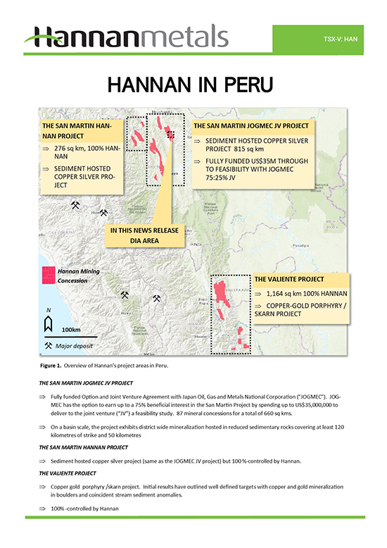 Michael Hudson, CEO, states“The submission of our DIA is a major milestone for Hannan. Our maiden low impact drill program will consist of up to 10 drill platforms to thoroughly test the extensive copper-shale horizon with holes up to 500 metres depth. We are thankful for all the detailed work of our employees and external experts and the support of the local communities during the public participation meetings, as well as the advice from various government agencies. The first drill program at San Martin will be a watershed moment, with the opportunity to outline the scale and grade of the extensive copper-rich shale horizon into the third dimension after mapping continuity of the copper mineralized shale over a 9-kilometre x 1-kilometre surface area at Tabalosos.”