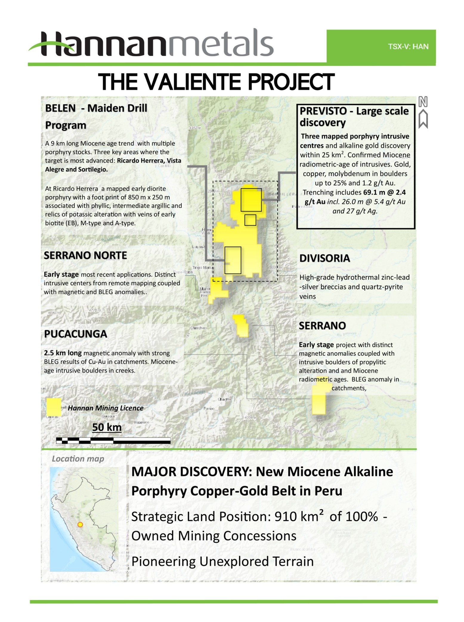 During 2021 Hannan staked and still holds 910 km2 of 100% owned mining concessions at Valiente covering unexplored terrain for potential mineralized porphyry targets in central eastern Peru. The Valiente Project has rapidly evolved from a greenfields prospect to a multi-prospect opportunity.