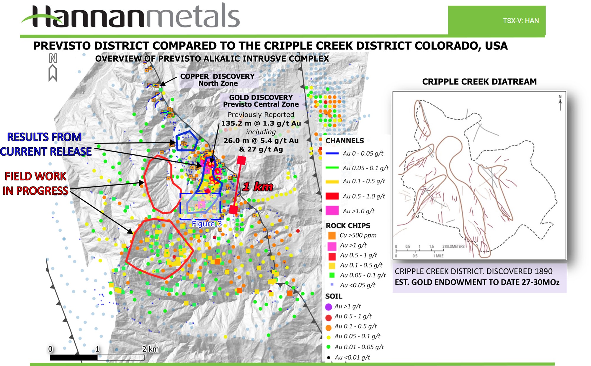 Figure 2: Map showing the vast 5×5 km gold anomaly at Previsto and the location of the current results, in comparison to the Cripple Creek gold district.