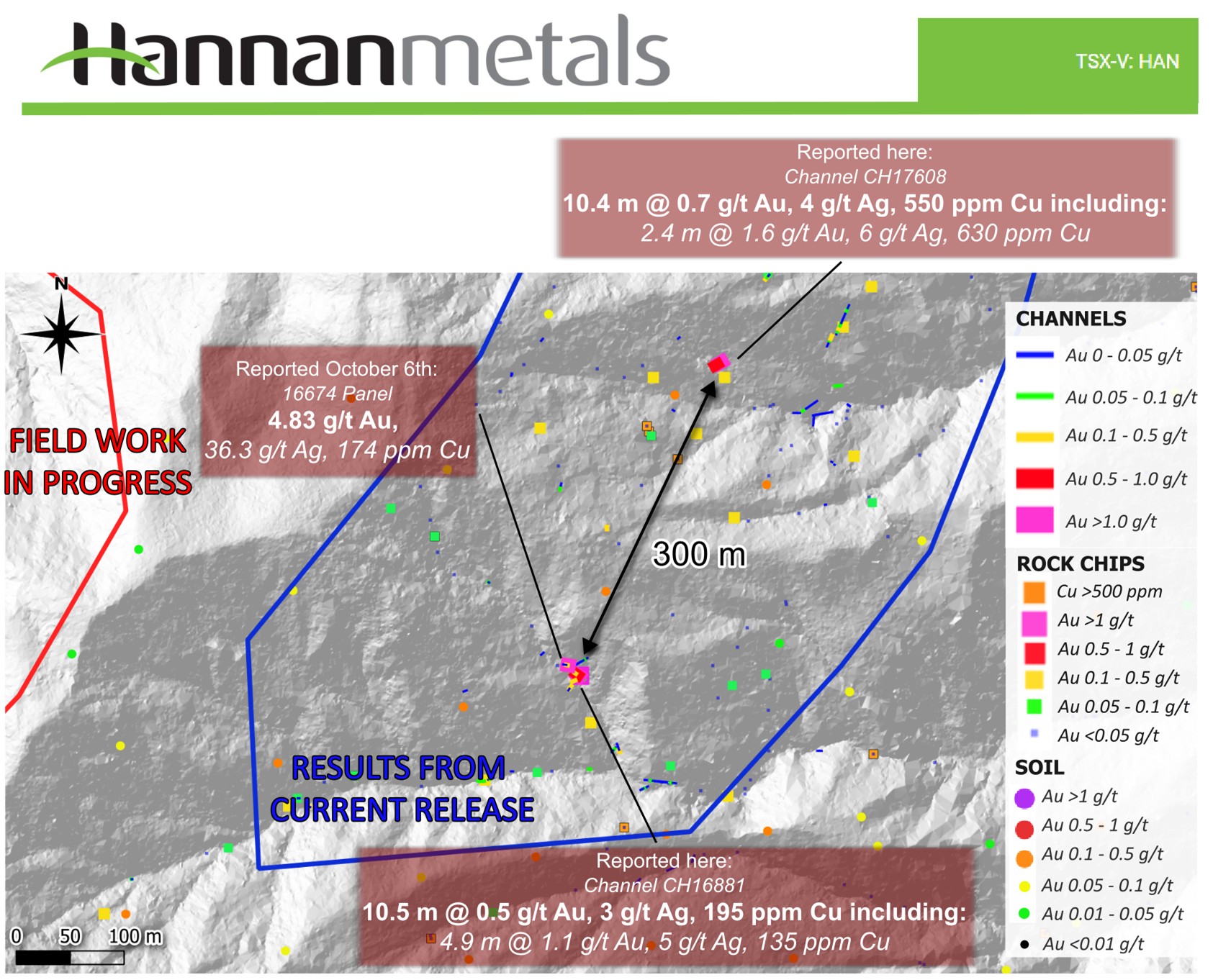 - 10.5 m @ 0.5 g/t Au and 3 g/t Ag including 4.9 m @ 1.1 g/t Au and 5 g/t Ag at the location of the previous 4.8 g/t Au grab sample, implying continuity over 1 km to the 26.0 m @ 5.4 g/t Au channel reported earlier this year.