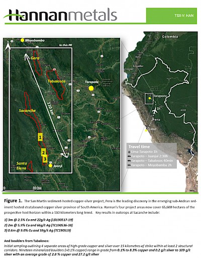 Vancouver, Canada – Hannan Metals Limited (“Hannan” or the “Company”) (TSXV: HAN) (OTCPK: HANNF) provides an update on the status of further granted mining concessions at the 100% owned San Martin sediment hosted copper-silver project in Peru (Figure 1).