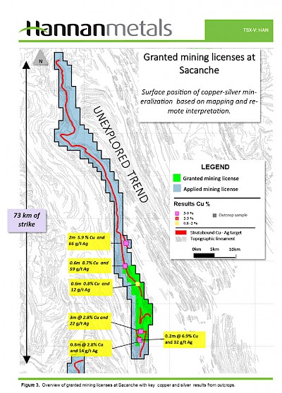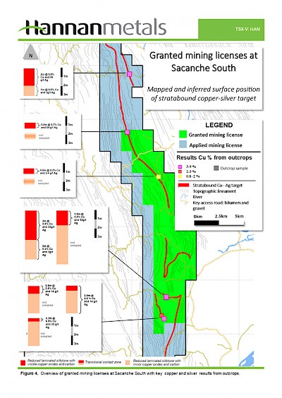 New areas granted are from the Sacanche project, where stratabound copper silver host position has been recently mapped by a geological remote sensing study within an area of 73 kilometres of strike. Outrcropping mineralized zones have been identified from field work (Figures 3 and 4) over a 20 kilometre strike trend and include: