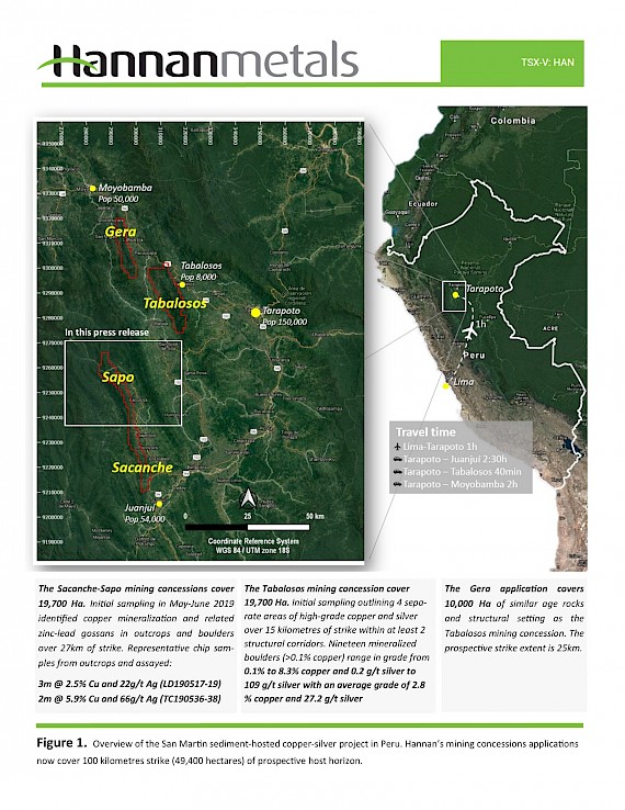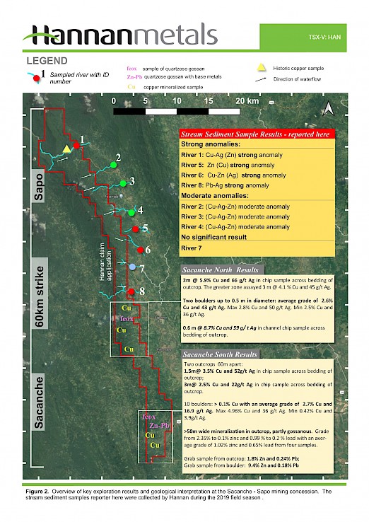 - The new Sapo mining concession application covers a further 30 kilometres along strike from the same prospective host rocks as found at Sacanche, being located immediately along strike from high-grade copper silver mineralization that Hannan recently identified, assaying up to 2m @ 5.9 % Cu and 66 g/t Ag (Hannan news release 01 Aug 2019);